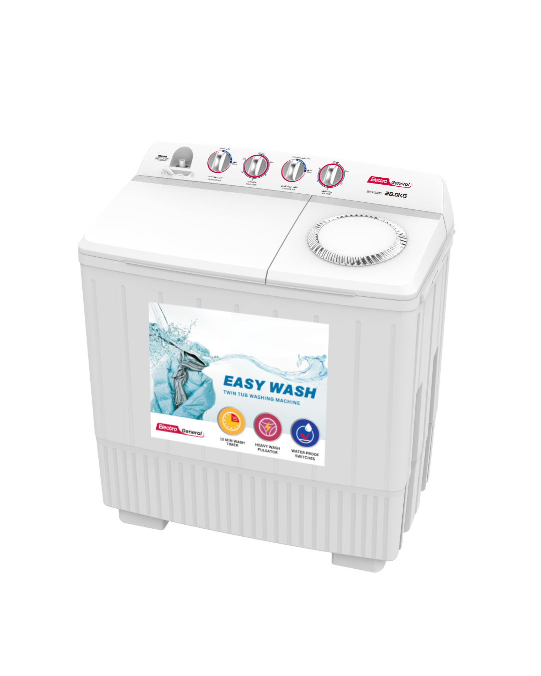 Electro General Semi-Automatic Washing Machine WXK-2800, 28KG Wash Capacity, 14.5KG Spin Capacity, 15-Minute Wash Timer, 5-Minute Spin Timer, Waterproof Switches, Magic Cleaning Filter, Water Inlet Selector, Air Drying, Heavy Wash Pulsator