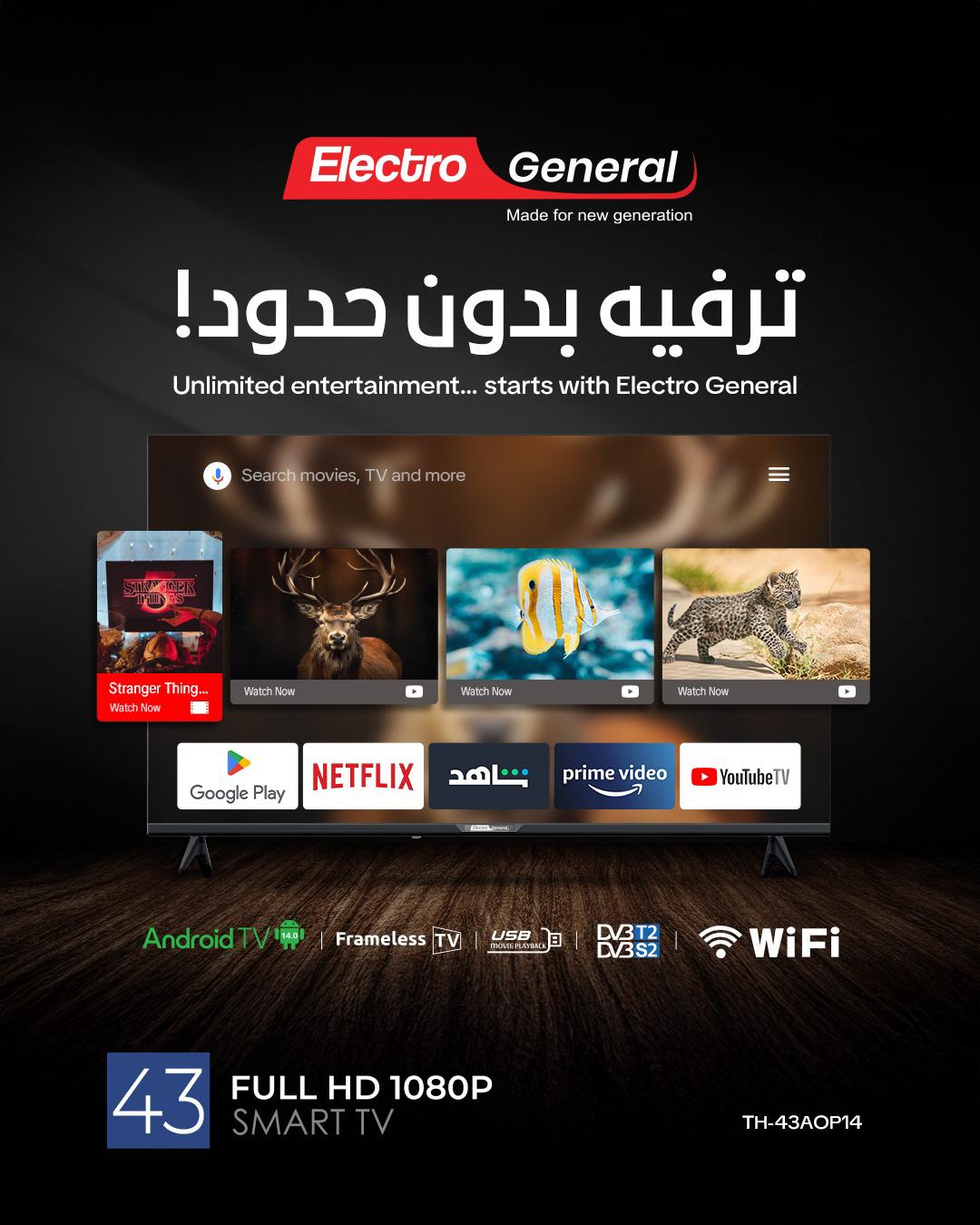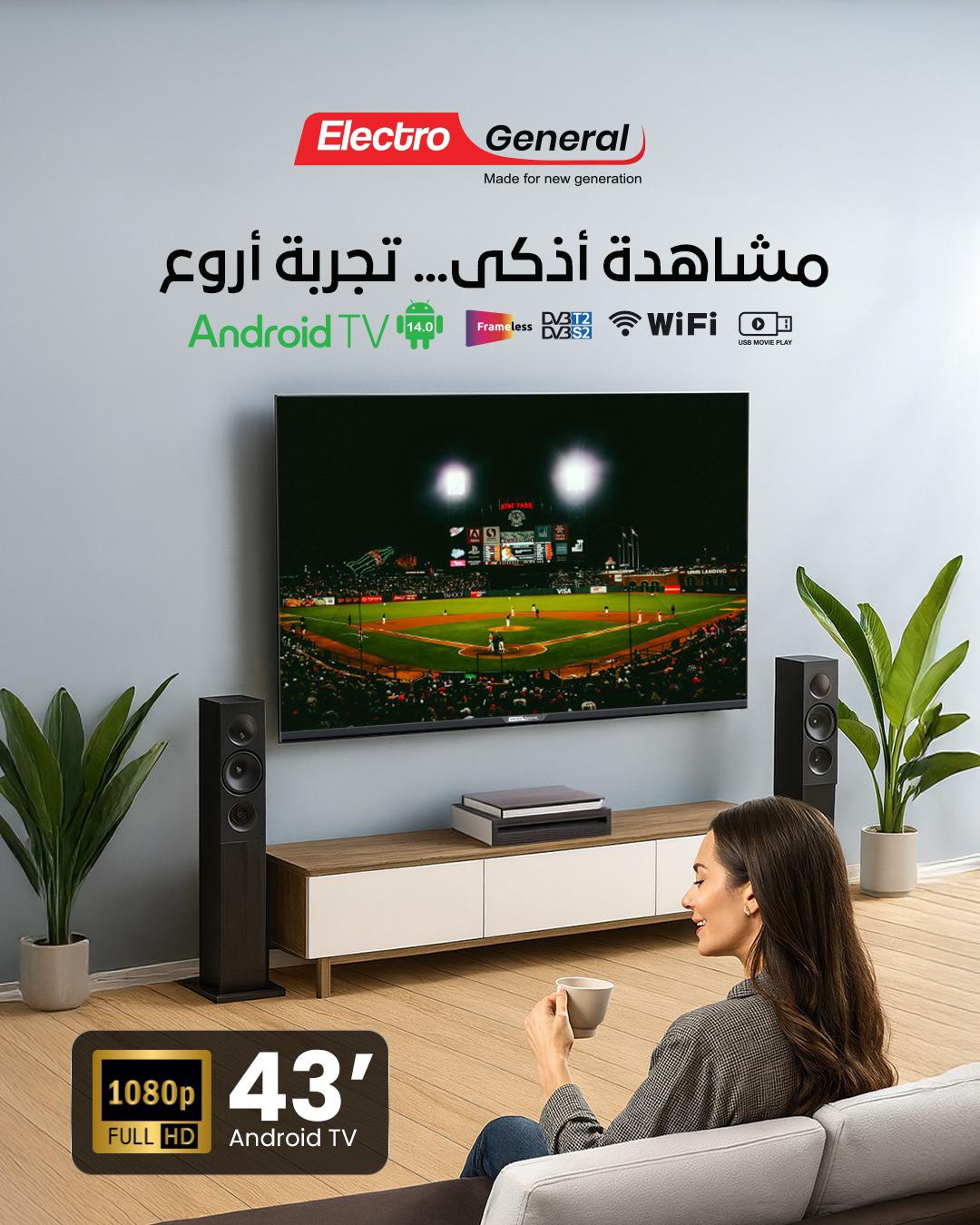Electro General 43″ Android 14 TV, Full HD 1080P, 1GB RAM/8GB Storage, DVB-T/T2/S2, 3 HDMI Ports, 2 USB Ports, 2 x 8W Speakers, Wi-Fi, 100-240V, Plastic Base