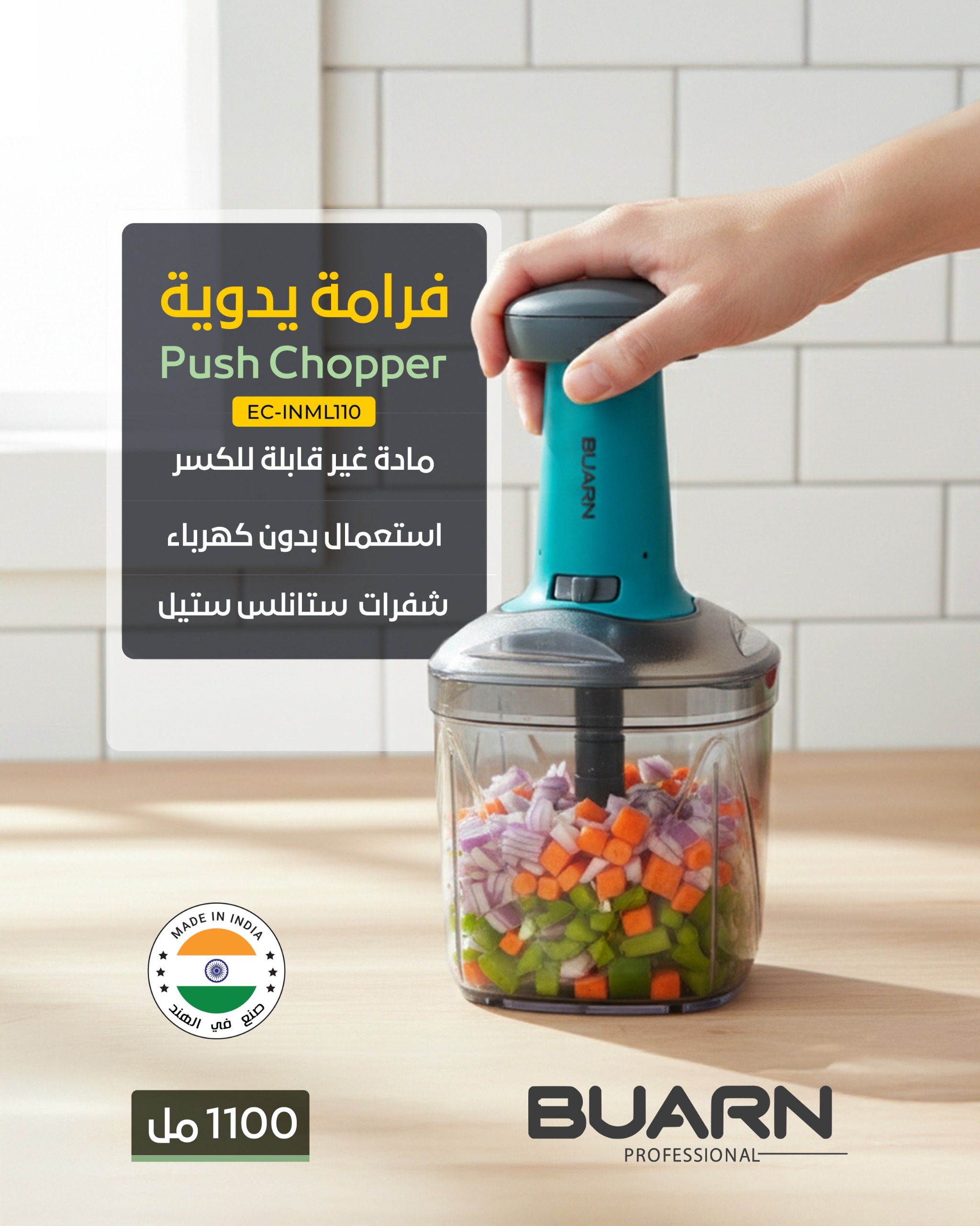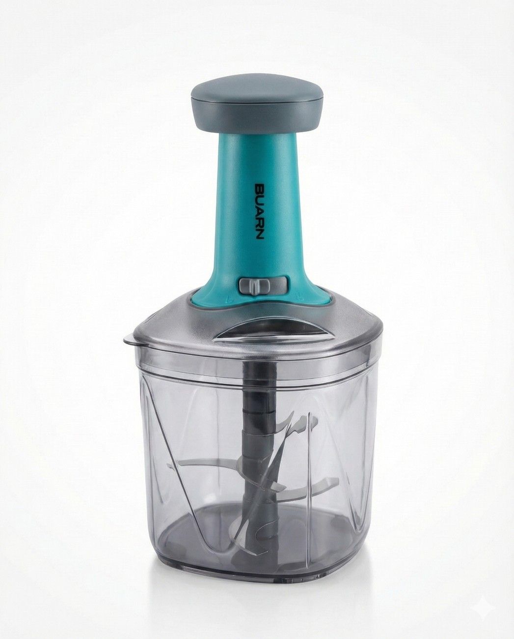 BUARN Push Chopper EC-INML110, 1100ML, Portable, BPA-Free, Sharp Stainless Steel Blade, Transparent Container, Safe Lid Lock