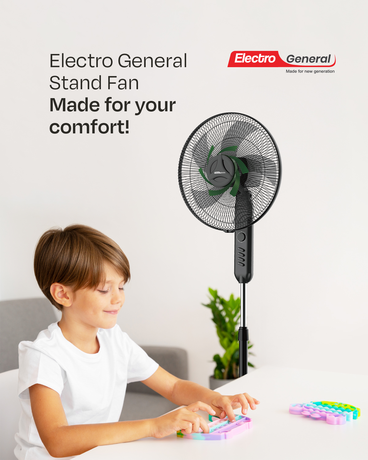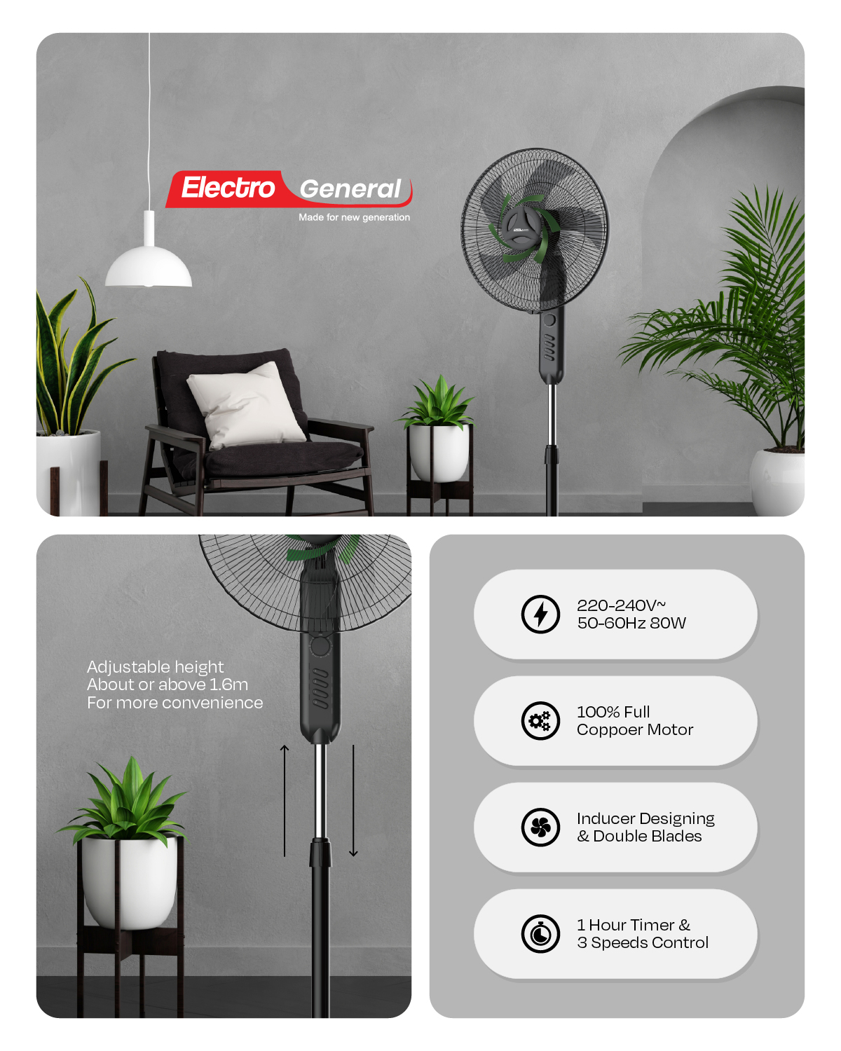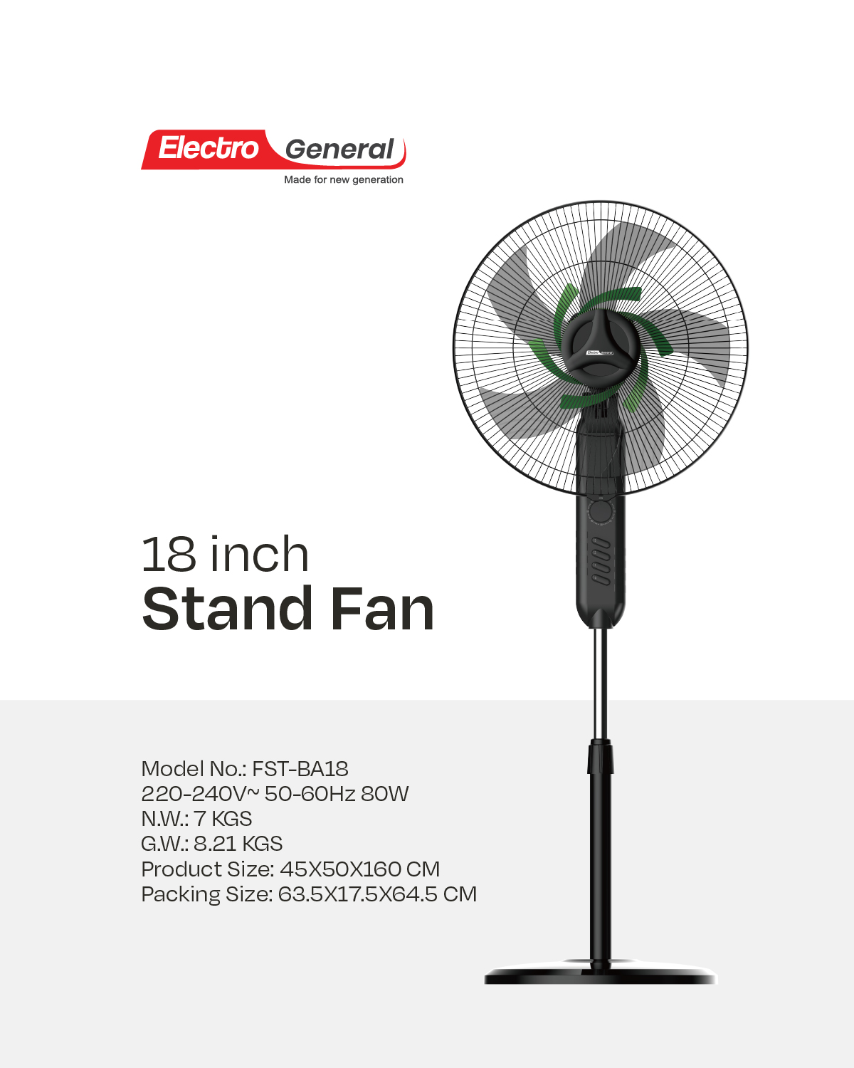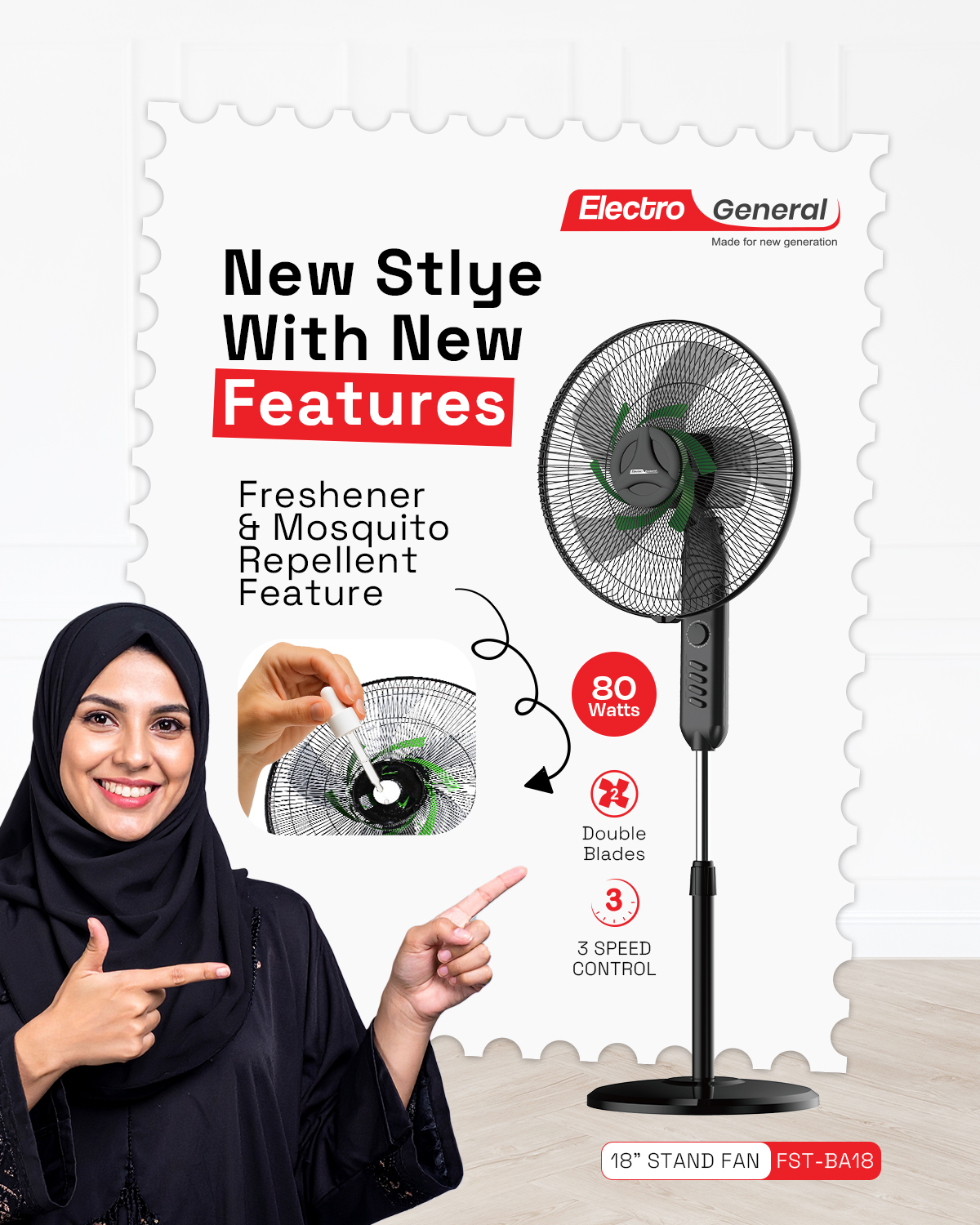 Electro General 18″ Stand Fan FST-BA18, 80W, Full Copper Motor, 3-Speed Control, 1-Hour Timer, Freshener & Mosquito Repellent, Inducer Designing & Double Blades, Adjustable Height (1.6m+), Heavy Round Base.