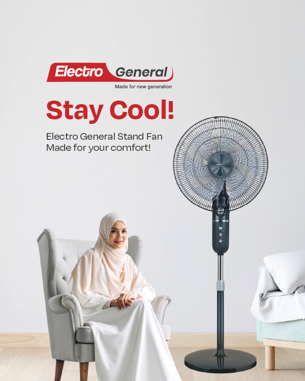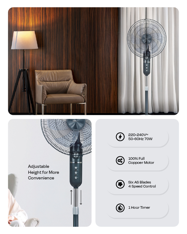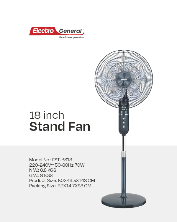 Electro General 18″ Stand Fan FST-BS18, 70W, Full Copper Motor, 4-Speed Controls, 1-Hour Timer, 6 AS Blades, Adjustable Height, Heavy Round Base