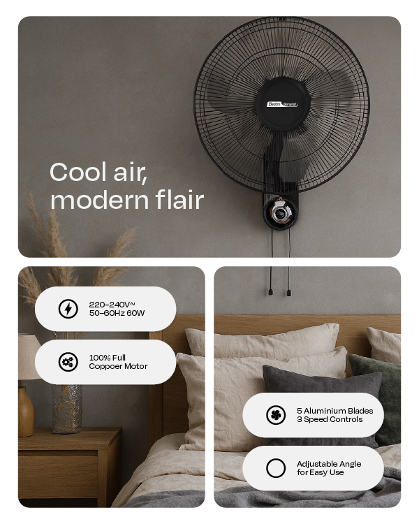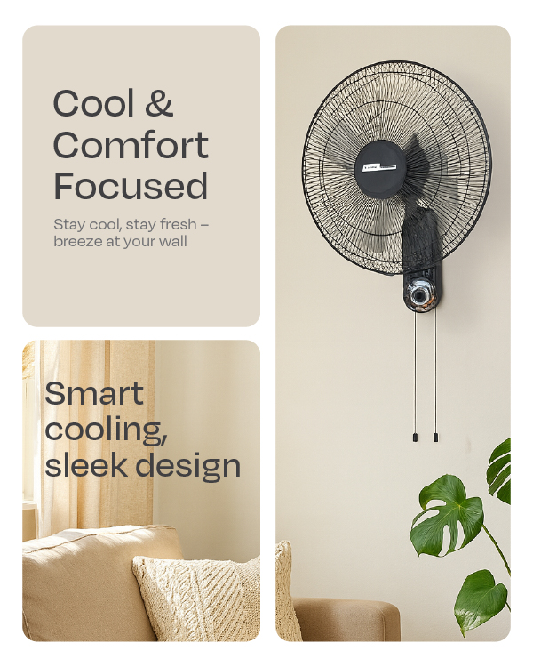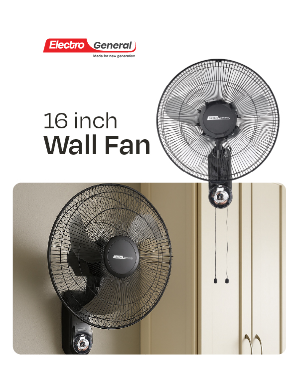 Electro General 16” Wall Fan FWL-BK16, 60W, Full Copper Motor, 5 Aluminium Blades, Low Noise, 3-Speed Control, Adjustable Angle.