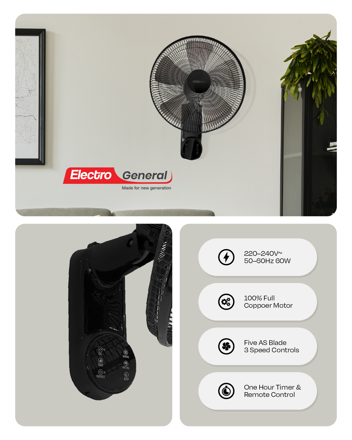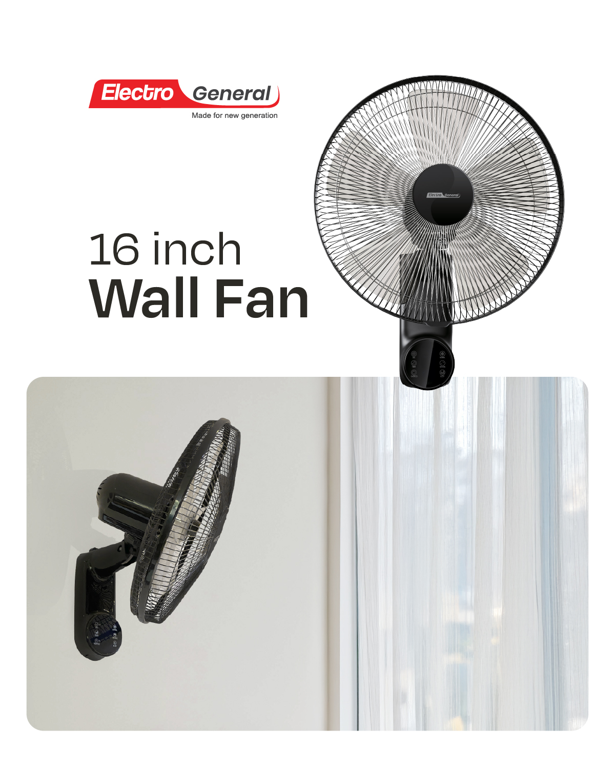 Electro General 60W 16″ Wall Fan with Remote Control FWL-BK16R, Full Copper Motor, 5 Blades, Low Noise, 3-Speed Control, 12-Hour Timer, 220-240V,